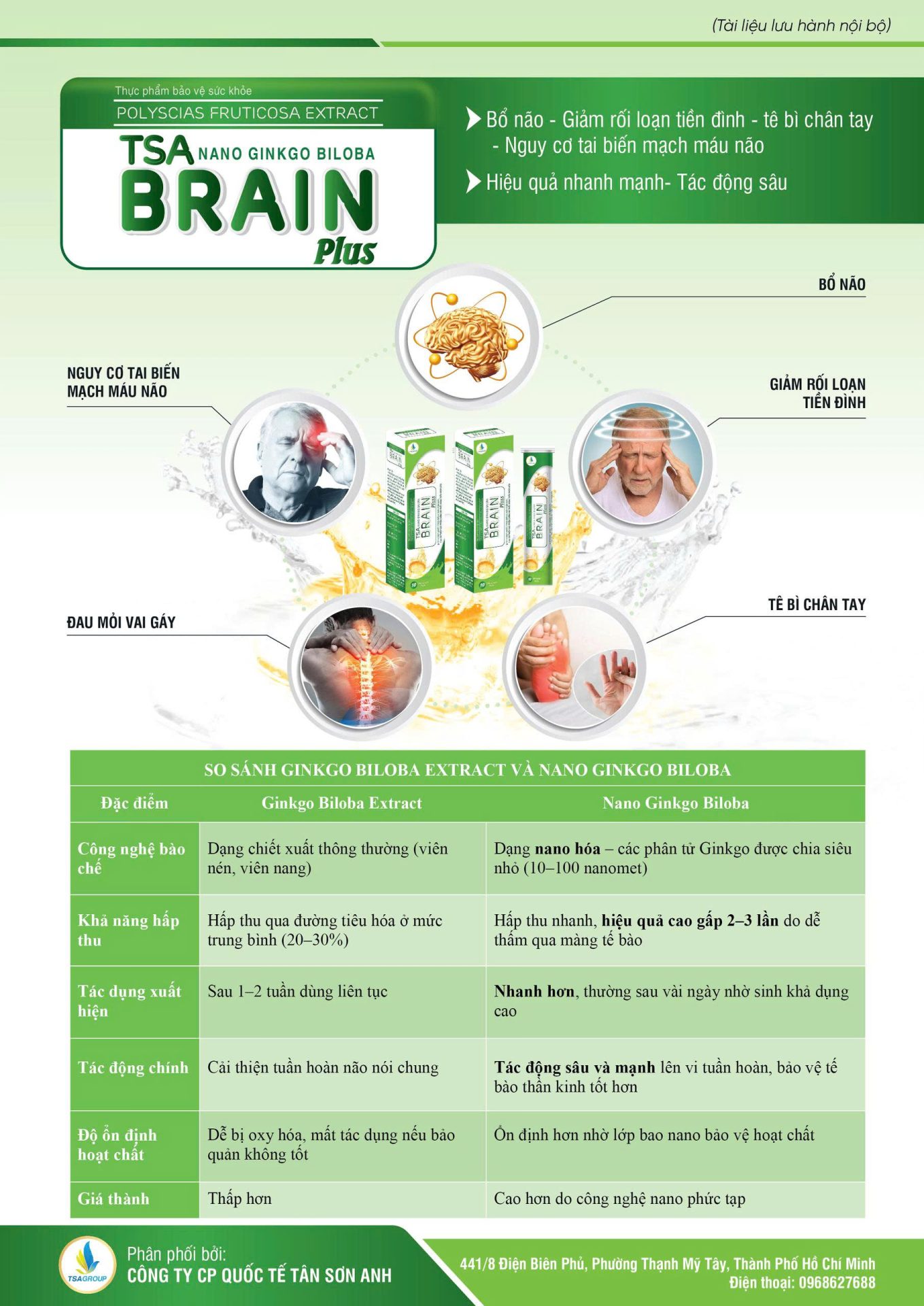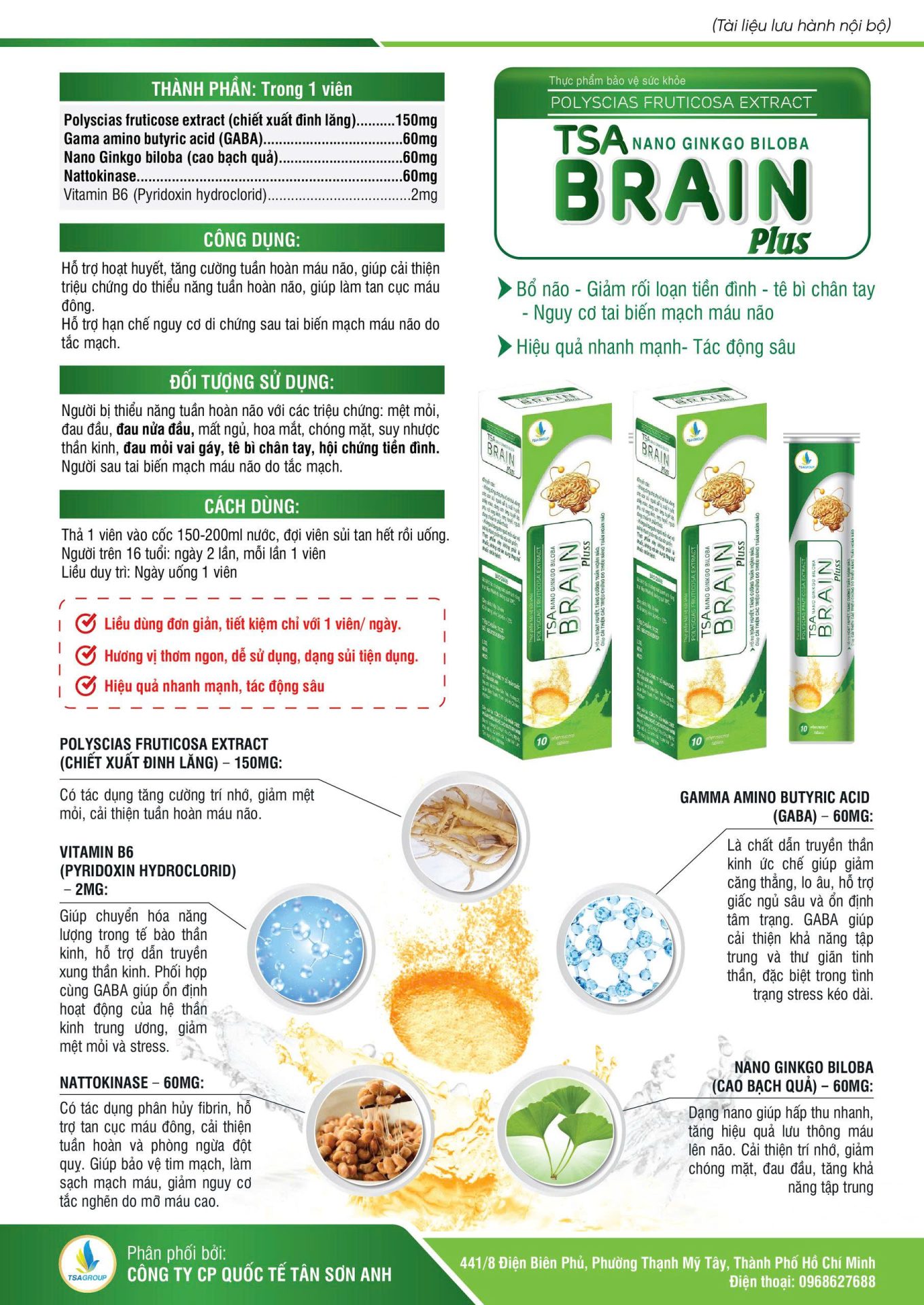 TSA Brain Plus là thực phẩm bảo vệ sức khỏe, hỗ trợ hoạt huyết và cải thiện tuần hoàn máu lên não. Sản phẩm phù hợp với người thường xuyên bị đau đầu, mất ngủ, chóng mặt, tê bì chân tay hoặc đang trong quá trình phục hồi sau tai biến mạch máu não do tắc mạch.
